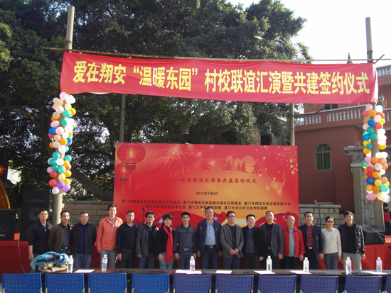 1月6日,新年伊始,冬日煦暖的阳光催生着新的希望。下午1时,“爱在翔安 温暖东园”村校联谊汇演暨共建签约仪式在翔安区新店镇东园社区大戏台隆重举行,药学院团委书记王洁松、公共卫生学院团委书记黄佳佳与东园社区居委会主任张世忠、东园小学校长洪世聘代表共建双方签订了协议,这标志着酝酿近两个月的村校共建正式启动。