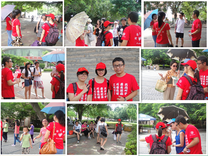 在首日6月30日的活动中,导游队的志愿者们身着特制的印有logo和标语的红色t恤,头戴小红帽,在校园内巡回流动服务。这些文明小使者们不顾酷暑,耐心细致地为游客服务,对不文明行为进行了适当的劝导,300份倡议书发放一空。他们对校园内交通、地理、餐饮和其他服务设施的分布都很熟悉,对维护校园文明整洁有深刻认识和自觉性,谈吐得体,得到帮助的游客们不断表示感谢最后满意的离开。他们为维护校园和谐美丽贡献了青年学子的一份力量,展现了厦大学子的青春风采,形成了校园里一道美丽的风景线。