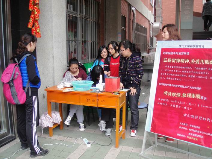 3月6日,药学院学生会积极响应校团委的号召,结合我院自身实际开展了以“弘扬雷锋精神,关爱用眼健康”为主题的学雷锋活动。早上十点开始,志愿者们就冒雨在芙蓉餐厅门口布置我们的便民服务点,十点二十左右,活动正式开始了。路过的同学们纷纷朝我们的服务点走来,志愿者们耐心细致地为同学们清洗并擦干眼镜,然后礼貌地递还给同学,大多数同学戴上眼镜后都觉得视线明亮了许多,纷纷向志愿者们表示感谢。还为一些同学免费更换了老化、损坏的零部件。同时,志愿者们在食堂门口向同学们发放宣传单,一方面向大家宣传雷锋精神,另一方面结合我们的专业知识,向大家普及健康用眼的知识。下课后,来洗眼镜的同学越来越多,志愿者们毫不慌乱,有序地为大家服务,时不时传来同学们的赞扬声,称赞我们的活动很实在、很有意义。志愿者们得到大家的肯定都很欣慰,也更加有动力了,虽然牺牲了大家的午睡时间,不过同学们都表示能为大家服务很开心,希望今后能多参加类似的活动。