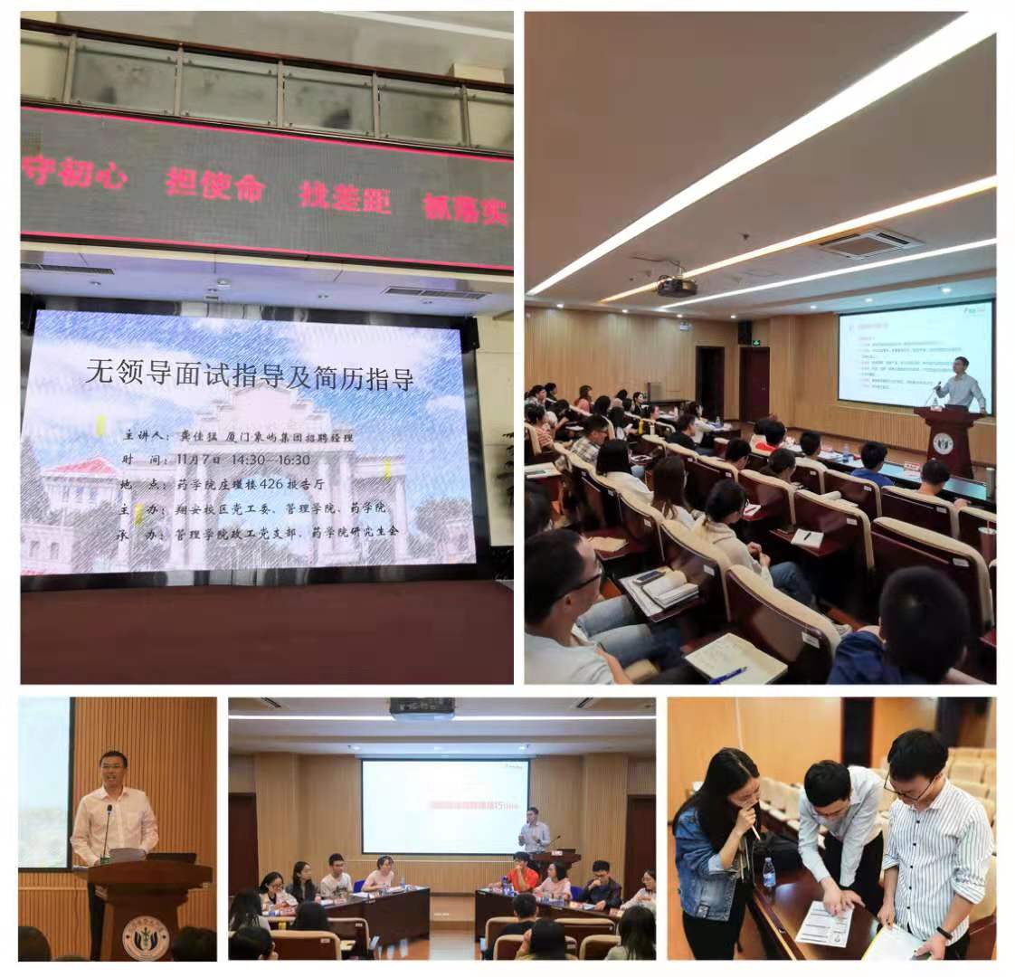11月7日,由厦门象屿集团招聘经理、厦门大学2015届校友龚佳猛担任主讲嘉宾的“无领导面试及简历指导”讲座如期而至,来自药学院、公共卫生学院、医学院、环境与生态学院的90余名应届毕业生,齐聚药学院庄瑾楼426报告厅,认真聆听专业指导。讲座由药学院党委副书记杜超主持。
