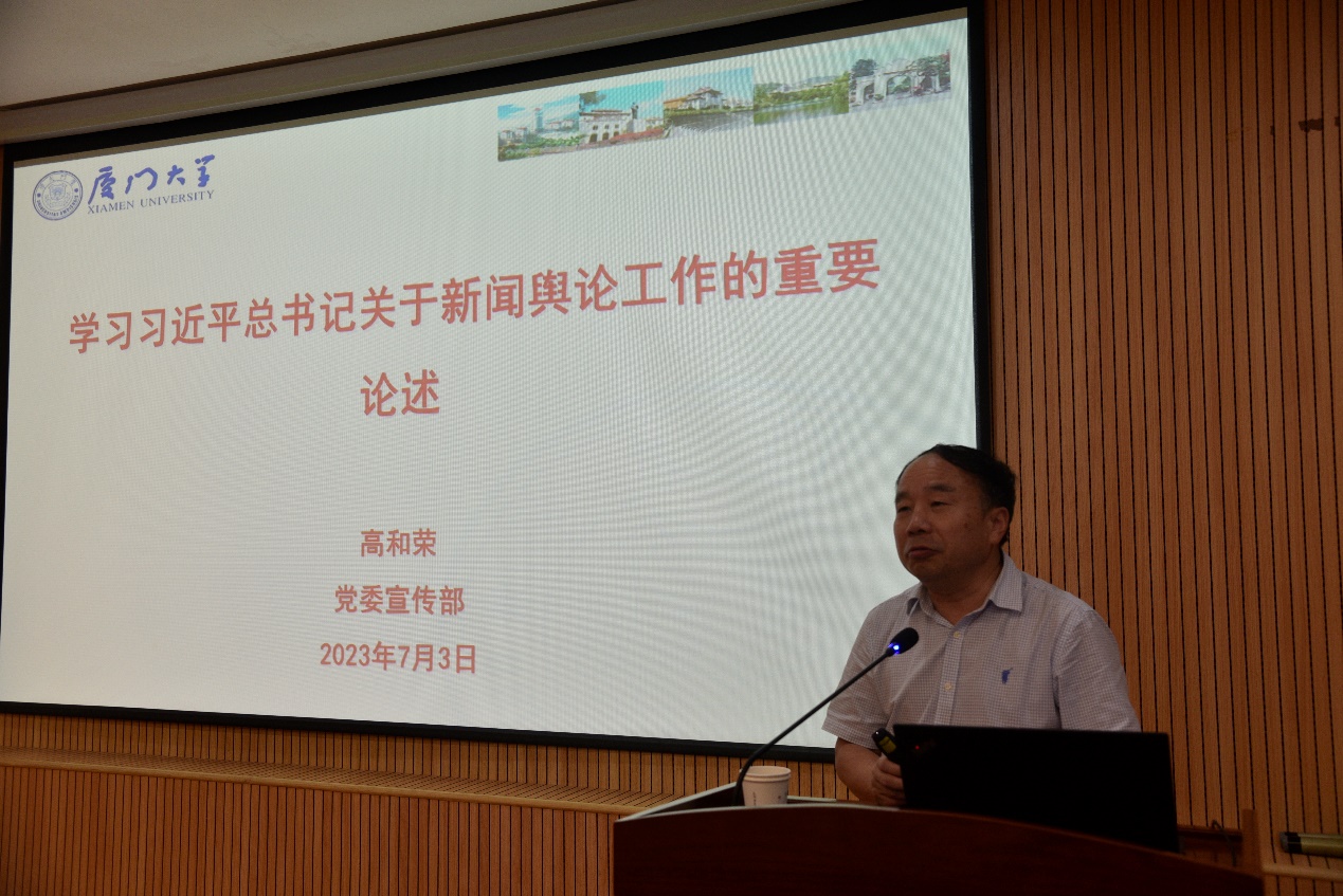 高和荣以《学习习近平总书记关于新闻舆论工作重要论述》为题作专题报告。他从“新闻舆论工作的重要地位”“重视新闻舆论工作的依据”“新闻舆论工作的四大挑战”“高校舆情事件”“提升能力与素养”等五个方面,引经据典、深入浅出地讲解了如何做好新时代党的新闻舆论工作。他表示,宣传思想工作要提高站位、乘势而为,主动融入国家大局,对标对表、争创一流,保持有温度、有深度、有热度的工作状态;要加强教师思想引领,密切关注教师思想动态和社会热点问题,在为师生办实事中切实关注教师所思;党员干部和教师员工要与时俱进提升个人素养与工作能力,勇担塑造灵魂、塑造生命、塑造新人的时代重任,为与时俱进建设世界一流大学贡献药学智慧与力量。