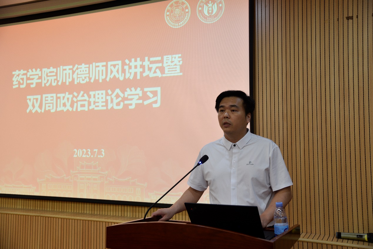 为进一步学习贯彻党的二十大精神,深入开展学习贯彻习近平新时代中国特色社会主义思想主题教育,扎实推进学院师德集中学习教育,7月3日,药学院举办师德师风讲堂暨双周政治理论学习,邀请厦门大学公共事务学院教授、党委宣传部/教师工作部部长、社科处处长高和荣作专题报告,学院副院长(主持工作)刘文作“院长谈准则”主题报告,党委书记宋友良作“书记亮警示”主题报告。学院全体教职工参加会议。会议由院党委副书记黄旻敏主持。