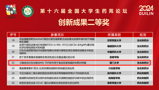经过激烈角逐,由药学院吴彩胜教授指导、2021级本科生林田同学负责的项目《三维结合衍生化联合MS-TDF软件用于食品危害残留的非靶向筛查》荣获创新成果二等奖。该项目利用三维结合衍生化改善了潜在风险化合物的色谱行为和质谱响应,结合课题组与电子科学与技术学院董继扬教授团队合作研发的MS-TDF软件,提出了一种食品危害残留的非靶向筛查策略,能够显著降低假阳性率,大幅提高筛查效率。