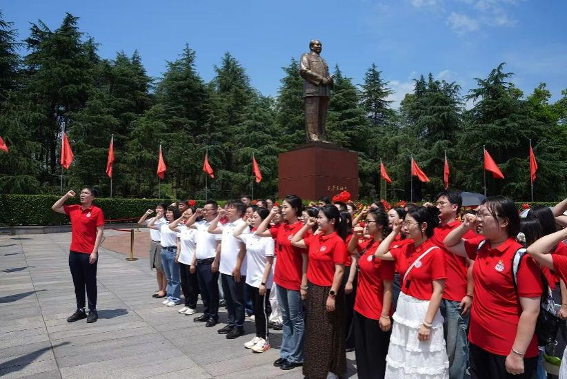 青山含翠,松柏凝碧。药学院一行怀着崇高的敬意抵达革命圣地韶山,与兄弟高校师生代表会合。在庄严肃穆的毛泽东广场,全体党员向毛泽东同志铜像敬献花篮,鞠躬致敬。面对鲜红党旗,同志们重温入党誓词,铮铮誓言穿透晨雾,在青山翠柏间久久回荡,彰显着赓续红色血脉、矢志奋斗报国的坚定信念。
