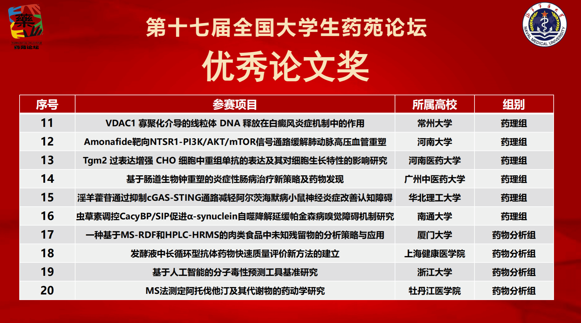 10月18日,第十七届全国大学生药苑论坛决赛在中国人民解放军海军军医大学圆满落幕。本届论坛共吸引全国126所高校的279项作品参赛,参赛高校数量与项目质量均创历史新高。