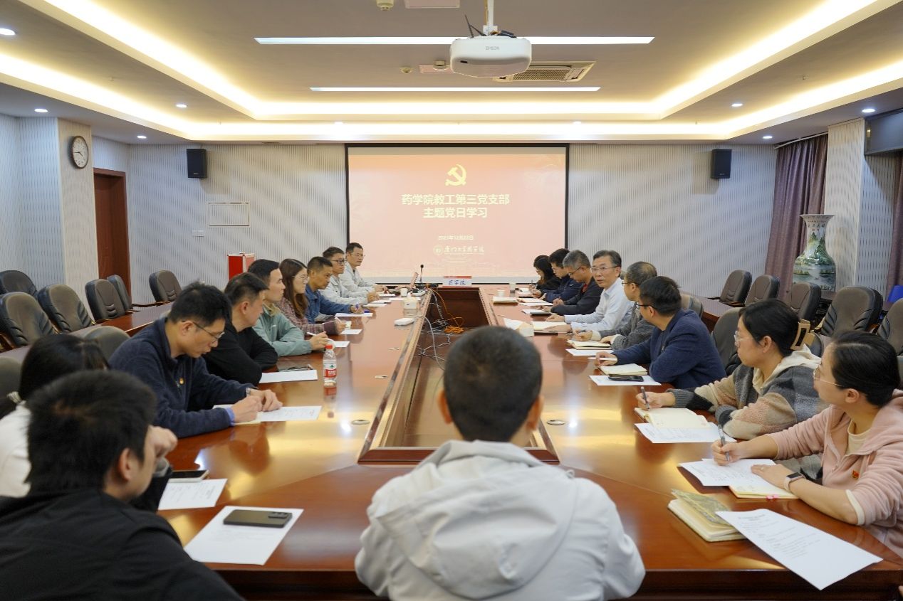 为深入学习贯彻党的二十届四中全会精神,强化党员纪律意识与使命担当,12月22日,药学院教工第三党支部在庄瑾楼520会议室组织开展“追求卓越、践行使命”主题党日活动。此次活动按照学院党支部工作 “一单三题”要求,精心设置“理论学习”“党纪党规学习”“讨论议题”三个环节,并融入2025年厦门大学师生党员基本培训第四次集中大课内容进行深入学习研讨。学院党委书记宋友良出席活动,支部全体党员参加。活动由党支部副书记严小胜主持。