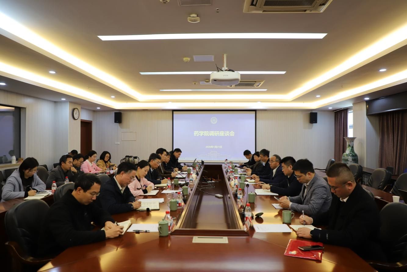 2026年1月21日上午,校长、中国科学院院士胡文平带队赴药学院调研,实地考察学院办学情况,与学院党政领导班子座谈交流,为学院“十五五”时期高质量发展把脉定向。调研座谈会在药学院520会议室举行,由学院党委书记宋友良主持。