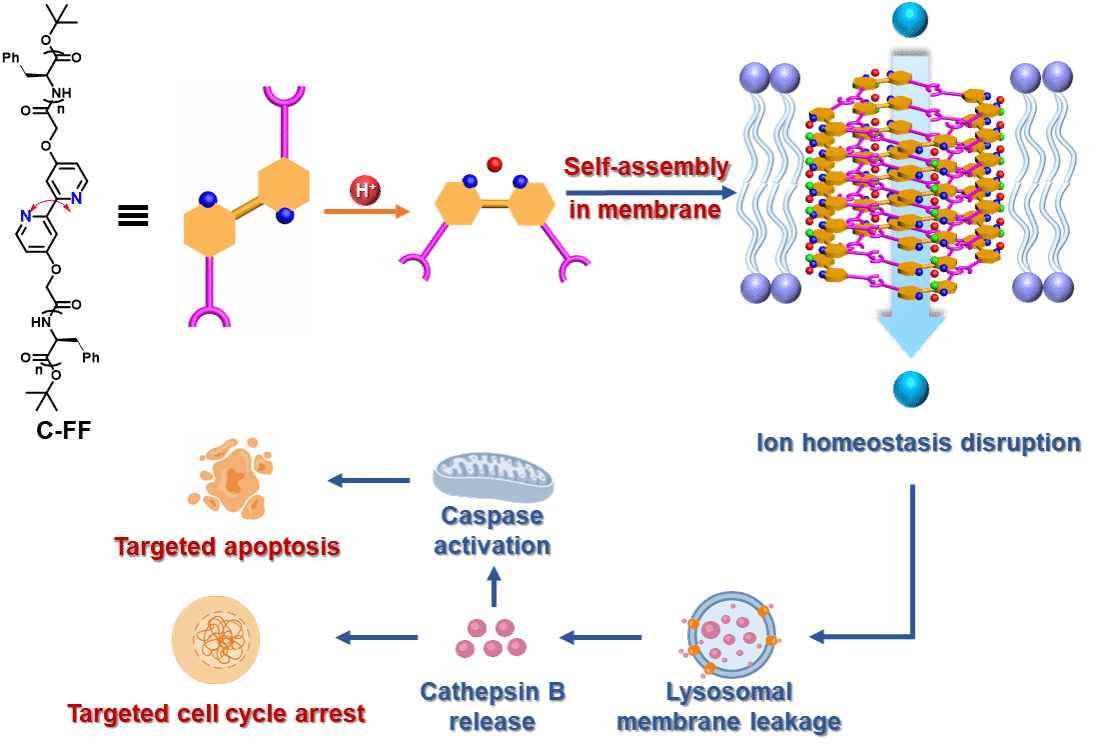 质子激活离子通道是一类能够感知胞外酸化并调控离子跨膜运输的重要生物通道,在缺血、炎症和肿瘤等酸性微环境中发挥关键调控作用。然而,能够在功能和调控方式上有效模拟天然质子激活通道的人工离子通道仍极为有限。另一方面,人工离子通道通过扰乱细胞内离子稳态诱导细胞凋亡,近年来已被视为潜在的抗癌策略。鉴于肿瘤组织普遍存在异常酸化的微环境,发展可被质子激活的人工离子通道,有望实现对癌细胞的精准识别与选择性治疗。