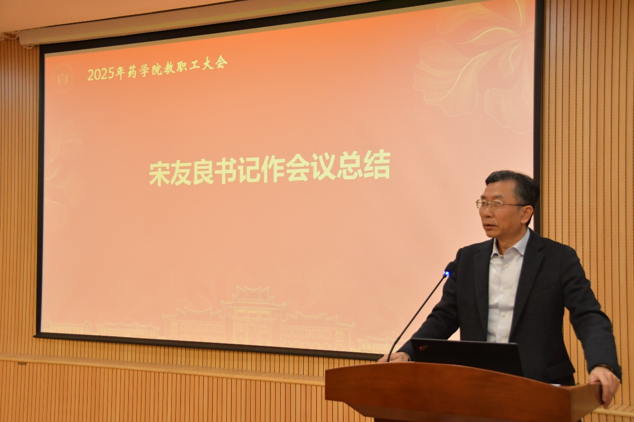 宋友良作会议总结。他首先肯定了2024年学院在党建思政、人才培养、科研工作、社会服务等方面取得的成绩,并对若干重点工作提出了下一步的工作思路。他强调,在人才培养方面,要对标一流药学人才培养,不断完善拔尖人才培养体系,强化有组织的教学;要持续加大学风的建设,合力营造良好的学习学术氛围;要加强优良师德师风建设,在人才培养各个环节切实做到严管、善导、厚爱。在科研工作方面,要强化有组织的科研,在整合资源、凝聚合力上下功夫,在找准方向、提升格局上下功夫,在主动出击、拓宽渠道上下功夫。在人才工作方面,要进一步加大人才引进与培育力度,扩大队伍总量和质量,全力支持想发展、能发展的老师。