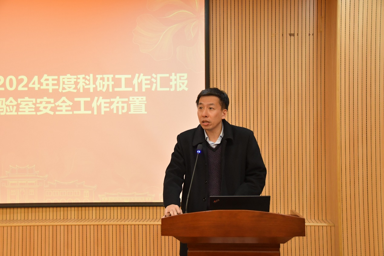 陈海峰汇报科研工作情况,强调实验室安全工作。他指出,2024年科研经费总量与前年持平,横向项目有待加强,纵向经费略增,有一定提升潜力。他针对科技成果转化的报备、基金申报书的修改完善、新设科研项目的申报、学术会议的参与和组织等方面做了提醒和建议,并分享了厦门市重点建设翔安南部片区、推动闽台科技合作等信息,希望大家关注相关机会。在实验室安全方面,他要求各实验室与学工口对接学生离校、返校时间,关心留校学生的生活状态,建立值日生制度,加强危化品管理,确保假期实验室安全。