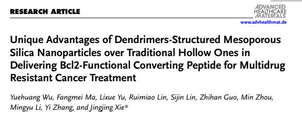 近日,药学院谢静静团队证实了树枝状大孔二氧化硅纳米粒子可以作为生物大分子药物的优势递送载体用于癌症的有效治疗,相关成果以“Unique Advantages of Dendrimers-Structured Mesoporous Silica Nanoparticles over Traditional Hollow Ones in Delivering Bcl2-Functional Converting Peptide for Multidrug Resistant Cancer Treatment”为题发表在Advanced Healthcare Materials杂志 。