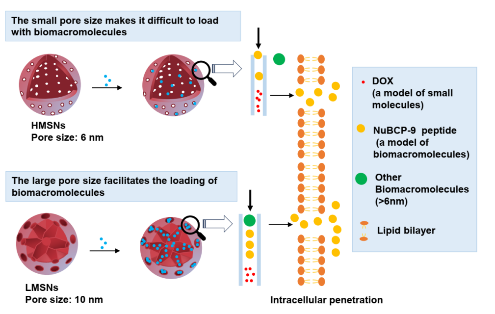在本研究中,作者以具有独特抗癌作用的Bcl-2功能转换肽(NUBCP-9)和临床常用抗癌药物阿霉素(DOX)分别作为生物大分子和小分子药物的模型,探究了树枝状结构的PSNs (LMSNs,孔径10 nm)和中空结构的PSNs (HMSNs,孔径6 nm)作为抗癌药物递送载体的效果差异。研究表明,LMSNs比HMSNs具有更高的NuBCP-9药物负载效率,更强的细胞穿透能力和诱导癌细胞凋亡的效果,能更好地靶向肿瘤和抑制耐药性肿瘤生长。然而LMSNs与HMSNs在递送DOX治疗耐药肿瘤方面却没有明显不同。研究还进一步表明,虽然高剂量下裸露LMSNs具有比HMSNs更强的细胞毒性,但表面适当的聚乙二醇化修饰则可显著降低其自身毒性,增加了在体安全性,从而更适于作为生物大分子药物治疗耐药性肿瘤的递送载体。