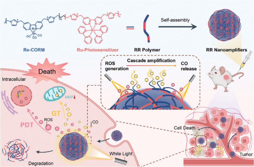 近日,霍帅东教授和刘爱洁副教授团队在Advanced Science期刊发表了题为“Biodegradable Ruthenium-Rhenium Complexes Containing Nanoamplifiers: Triggering ROS-Induced CO Release for Synergistic Cancer Treatment”的研究论文,报道了一种以钌配合物(Ru-complex)为光敏剂(PS)和铼配合物(Re-complex)作为一氧化碳(CO)释放分子(CORM)的可生物降解共聚物纳米放大器。该纳米放大器能够在光诱导下产生ROS,继而触发CO释放,用于增强抗肿瘤的协同治疗。