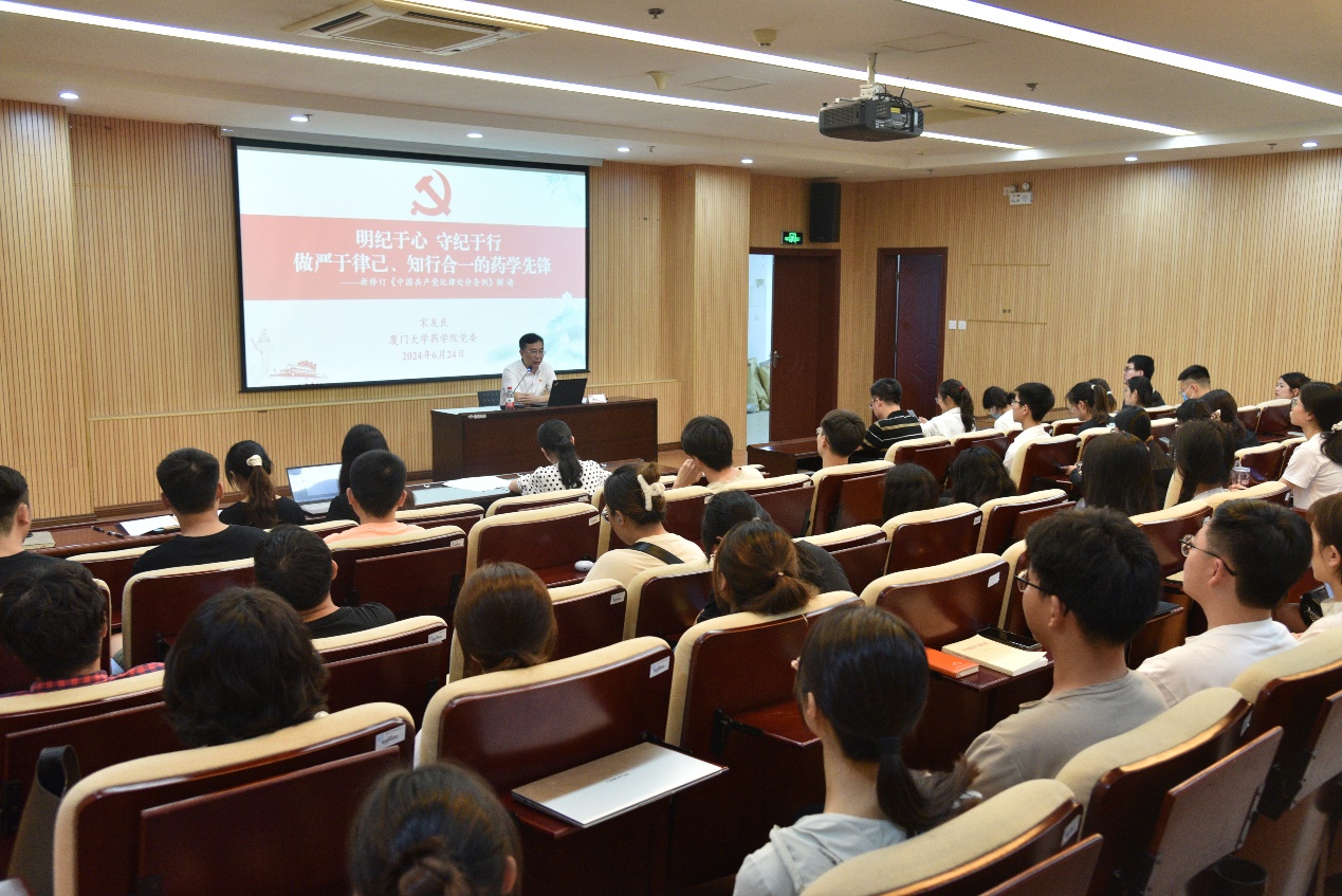 6月24日,学院党委书记宋友良以“明纪于心,守纪于行,做严于律己、知行合一的药学先锋”为题,为学生党团骨干讲授专题党课。学院学工组全体成员,党务秘书,学生党支部书记、支委,第三期“药学先锋班”全体学员,博士生党支部、本科生党支部全体成员参加了党课学习。