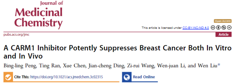 2024年5月7日,刘文教授团队在Journal of Medicinal Chemistry杂志上在线发表题为“A CARM1 inhibitor potently suppresses breast cancer bothin vitro andin vivo”的研究成果。该研究通过大规模筛选获得了高效和特异性靶向CARM1酶活性的新型小分子抑制剂iCARM1。iCARM1相比已知CARM1抑制剂表现出更好的酶抑制活性和特异性。同时,该抑制剂可以有效地抑制体外乳腺癌细胞和小鼠模型乳腺肿瘤的生长。该研究为以CARM1为靶点的抗肿瘤药物开发提供了新思路,为临床治疗乳腺癌提供了一种有前景的新策略。