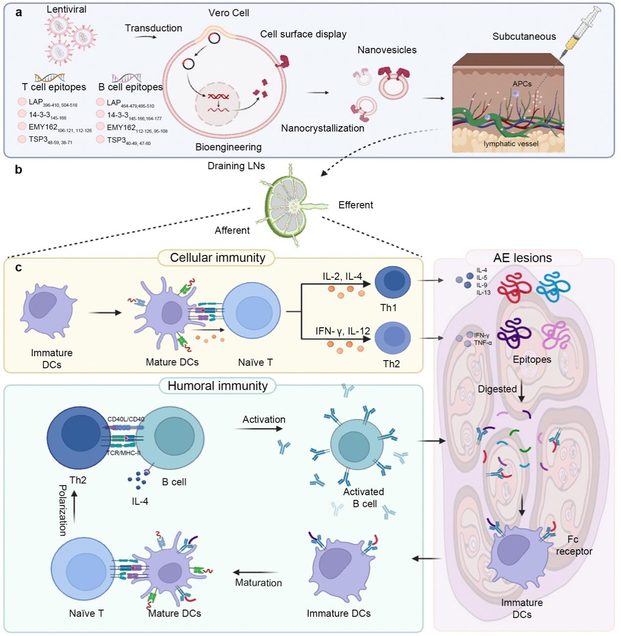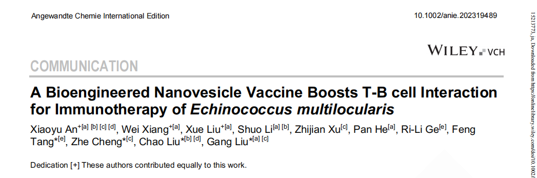 近日,我院刘超副教授团队、公共卫生学院刘刚教授团队与合作者提出一种可以消除多房棘球绦虫的创新疫苗策略。相关研究成果以“A Bioengineered Nanovesicle Vaccine Boosts T-B cell Interaction for Immunotherapy of Echinococcus multilocularis”为题发表于国际知名学术期刊Angewandte Chemie International Edition。该研究通过在细胞膜表面展示多房棘球绦虫优势抗原表位,构建了一种多房棘球蚴病特异性的工程化囊泡疫苗,该疫苗可高效激活树突状细胞,并诱导特异性T/B细胞互馈回路,抑制多房棘球蚴的感染及生长。
