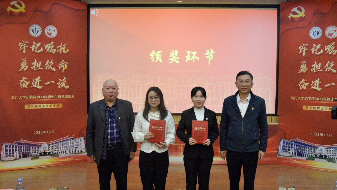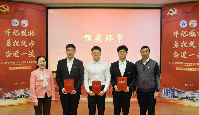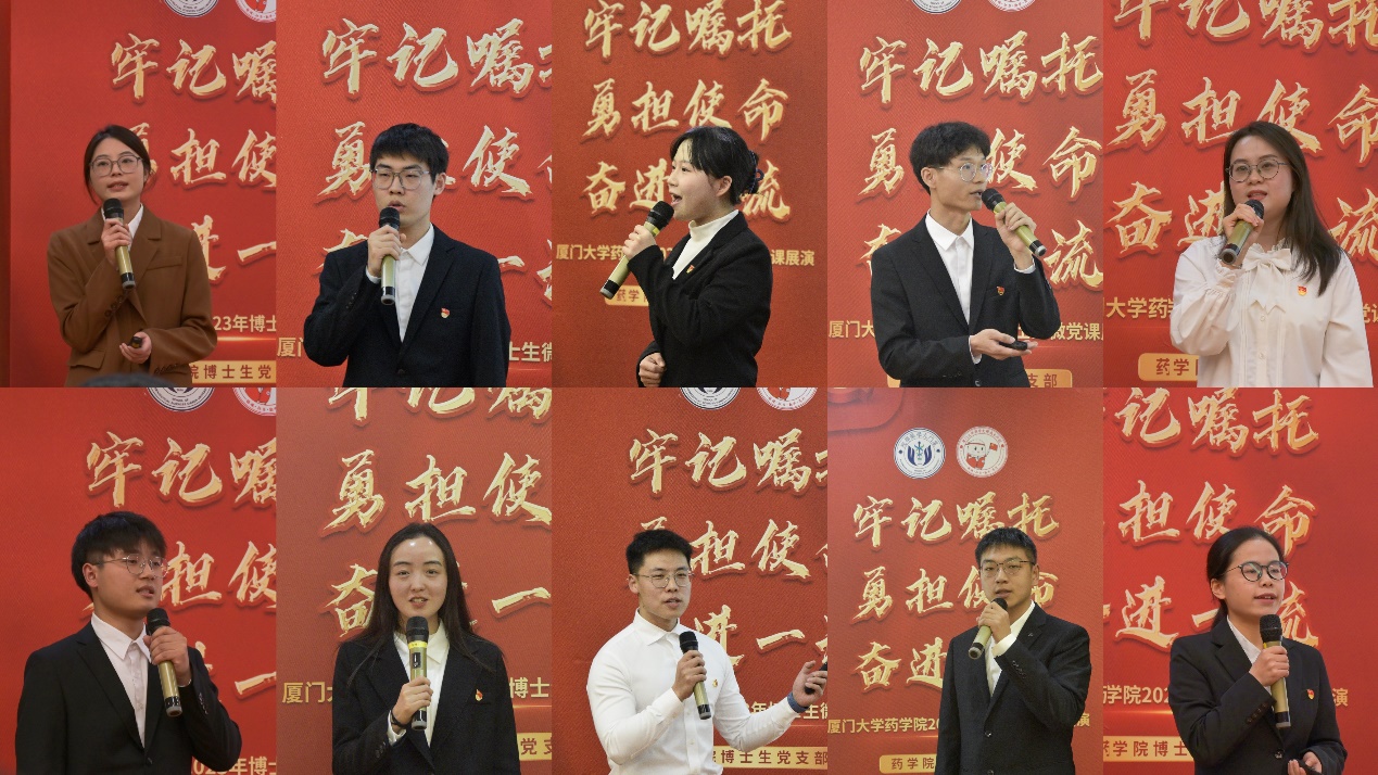 博士生卫子恒通过《海峡 海丝 海洋》向大家分享了厦门大学向海而生,以海为怀,走过百个四季轮回,在时代的洪流中奋辑争先的故事。博士生李佳媛以《科技创新的厦大答卷》为题,分享了药学院刘文教授以癌症研究为己任,以爱国情怀为指引,归国后在科研实践中言传身教、埋头钻研的故事。硕士生郭妙婷以《教育兴邦,强国有我》为题用自己的亲身经历,展示了厦门大学学子对口帮扶宁夏隆德的教育事业,以小我深度融入闽宁对口协作的风采。博士生李楚楚《高质量发展的“创新引擎”》介绍了厦门大学以翔安校区为“创新”支点,调整学科布局、改革人才培养模式、建设重磅科技平台的故事。博士生李嘉铖以《“三位一体”建设一流党支部》为题,展现出药学院博士生党支部通过构建“理论、实践、创新”三位一体的育人平台,充分发挥博士生党员先锋作用,努力创建全国研究生百个样本党支部。