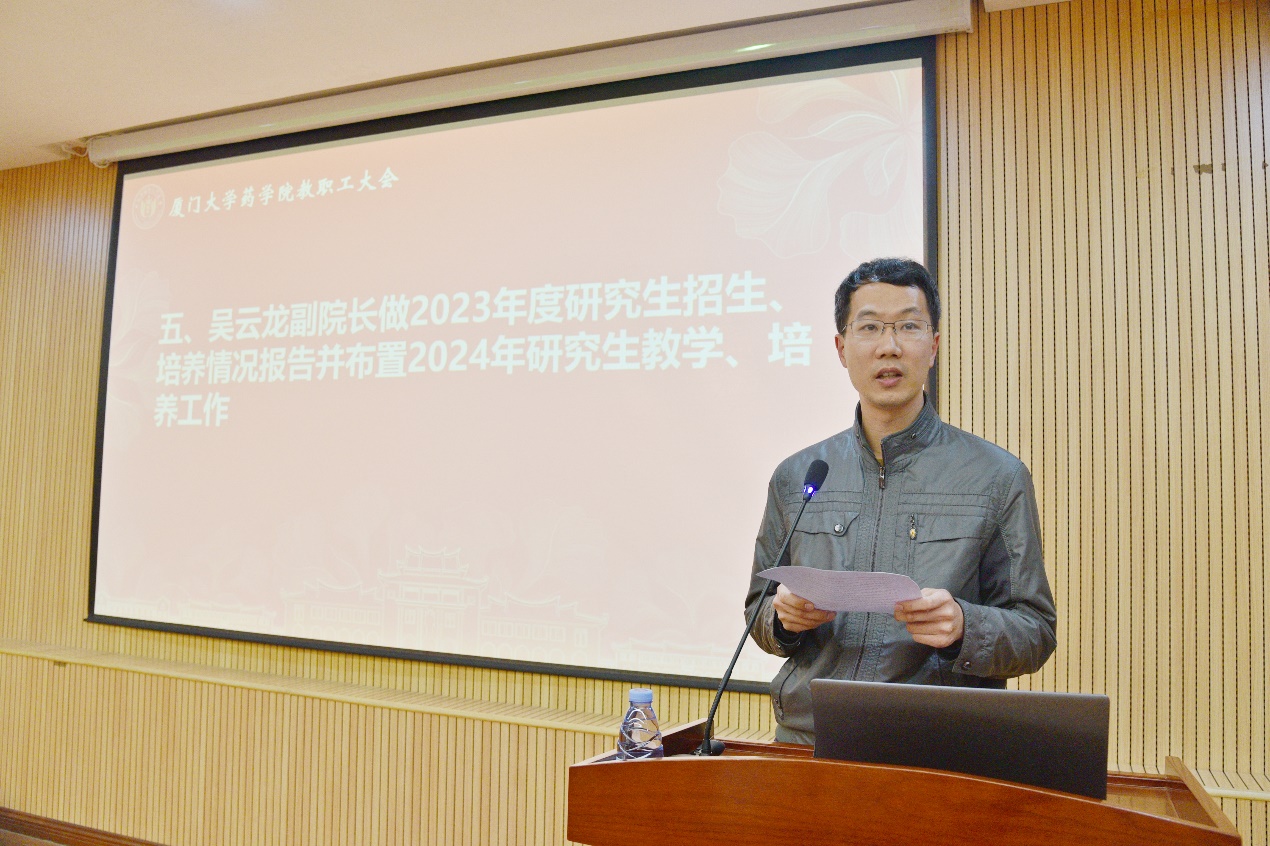 吴云龙报告学院2023年度研究生招生、培养情况,并布置2024年研究生教学、培养工作。他表示,学院在2023年获批药学博士一级学位授权点,取得学科建设的重大进展,顺利通过药学硕士专业学位授权点专项核验,在研究生生源质量、示范性课程建设、优秀案例建设等方面取得了新的成绩,召开3场学术会议、开展丰富的学术交流活动。他指出,学院下一步将重点建设药学博士培养方案,开展研究生课程改革。他要求导师严格把关学生论文质量,杜绝学术不端行为,提升研究生培养质量。