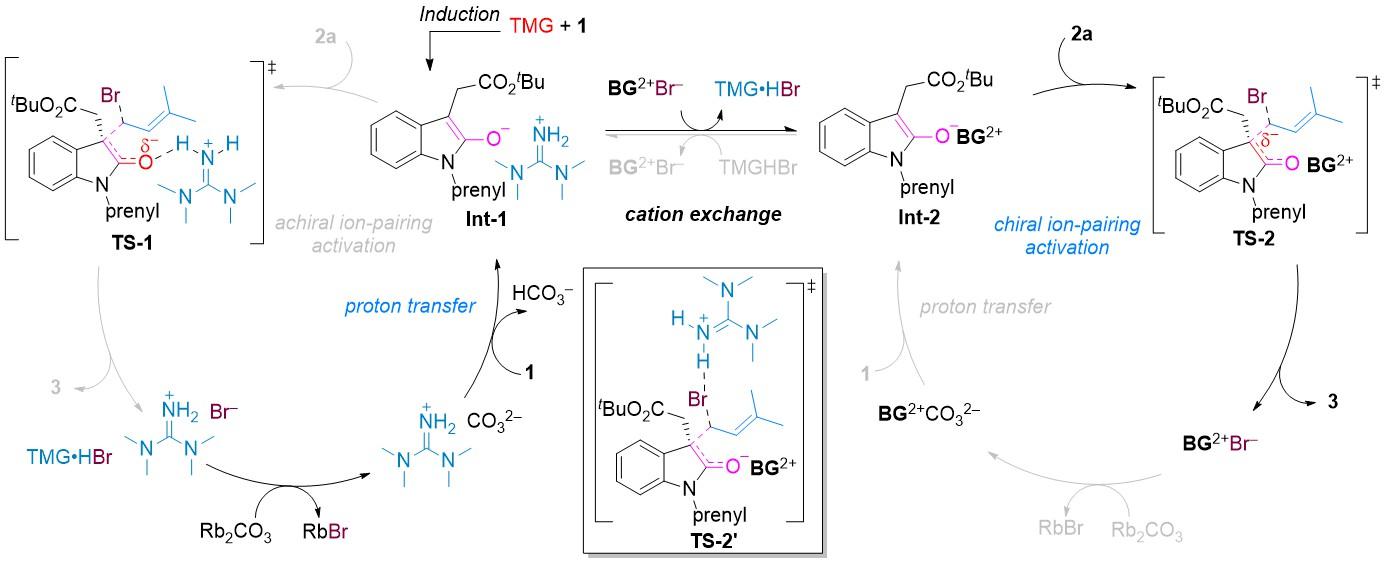 近日,福建省药物新靶点研究重点实验室、药学院教授宗利利团队首次报道了手性双胍阳离子和非手性布朗斯特碱1,1,3,3-四甲基胍(TMG)在3-取代氧化的不对称异戊烯基化、香叶基化、炔丙基化和苄基化反应中的协同催化作用,并通过机理研究证实了质子化的1,1,3,3-四甲基胍(TMG)将以非手性阳离子的形式存在于催化体系,通过助力无机碱的相转移过程以及通过氢键作用活化亲电试剂溴代烷烃等作用模式来增强反应的速率和对映选择性。采用该新型“协同催化”体系,团队在温和条件下实现了对一系列3,3-二取代氧化吲哚关键手性中间体的高效构筑,并将其成功地应用于海洋来源天然产物(−)-flustramine B、(−)-debromoflustramine B及其三唑类衍生物的全合成上,同时初步揭示了这些化合物的抗生物膜活性。这一研究成果显示出“手性阳离子对催化剂-非手性布朗斯特碱”协同催化方法在不对称催化领域广泛的应用潜力,同时为进一步开发海洋来源天然产物的新型抗菌药物提供了技术支撑和物质基础。