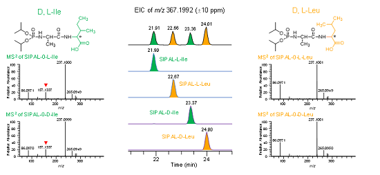 代谢物异构体包含结构异构体和立体异构体。在生物系统中,分子式相同但化学结构不同的结构异构体分子和立体异构分子是普遍存在的,它们各自发挥着独特的功能。氨基酸、小肽、脂类、碳水化合物连接异构体和修饰的核苷酸等结构异构体在初级代谢的特定条件下发挥着重要作用。同时,生物的同手性是地球上生命的一个复杂特征。代谢物的手性与多种代谢性疾病密切相关,包括癌症、糖尿病和神经退行性疾病等。生物进化通过产生了氨基酸消旋酶和D-氨基酸氧化酶等特异性酶,用于手性氨基酸的高效合成和选择性降解。在这种情况下,一个分子式可以产生多种的代谢异构体化学结构,扩展了多维化学空间,具有更多的生物学功能。然而,在非靶向代谢组学分析中,由于具有相似的化学结构和理化性质,区分含氨基代谢物的构造异构体和对映体仍然是一个很大的挑战。