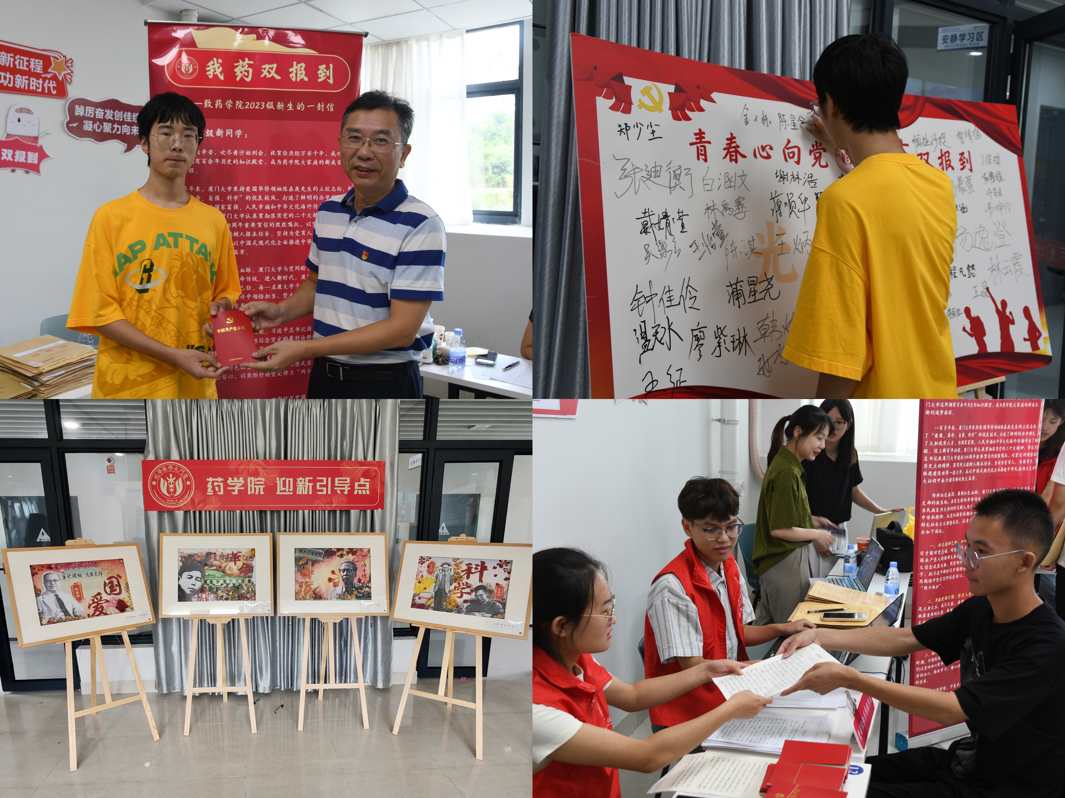 迎新现场,由学长学姐们精心制作的“厦门大学“青春心向党,芳草系真情”植物贴画创意设计大赛优秀作品陈列两侧,引得新生及家长们驻足停留。贴画作品以“爱国、革命、自强、科学”的优良校风为主题,号召新生们传承和弘扬嘉庚精神,在新的百年征程上贡献南强青年的囊萤之光。学院党委在开学前发出《致药学院2023级新生的一封信》,并围绕“青春心向党,我‘药’双报到”为主题展开氛围布置。宋友良亲手将《中国共产党章程》赠予递交入党申请书的新生,鼓励同学们要认真学习贯彻厦门大学第十二次党代会精神,赓续红色血脉,不负时代重任。