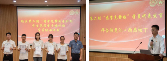严小胜为第二期“药学先锋班”学员代表颁发结业证书后,2020级本科生拜合热曼江·西热帕丁结合自己一年以来的收获与成长,表达了对老师们的衷心感谢,从“将学习视为成长之基”“将实践作为成长之需”“将困难化为成长之要”三个角度与大家分享了心得体会,勉励大家艰苦奋斗,让青春绽放出最美丽的花朵。