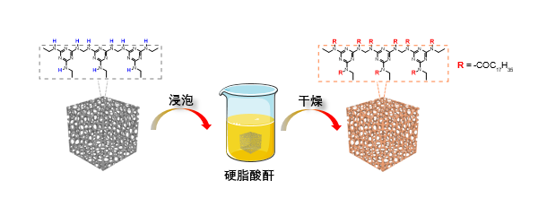 为解决上述难题,该团队从荷叶的微观结构得到启发,将硬脂酸酐与密胺海绵表面的仲胺基进行N-酰化修饰,该修饰方法一方面可以减少仲胺与水分子之间的氢键作用,创造出疏水屏障,将海绵骨架与水分子阻隔开,另一方面增加了海绵表面的粗糙度,进一步促进了海绵表面的疏水性。