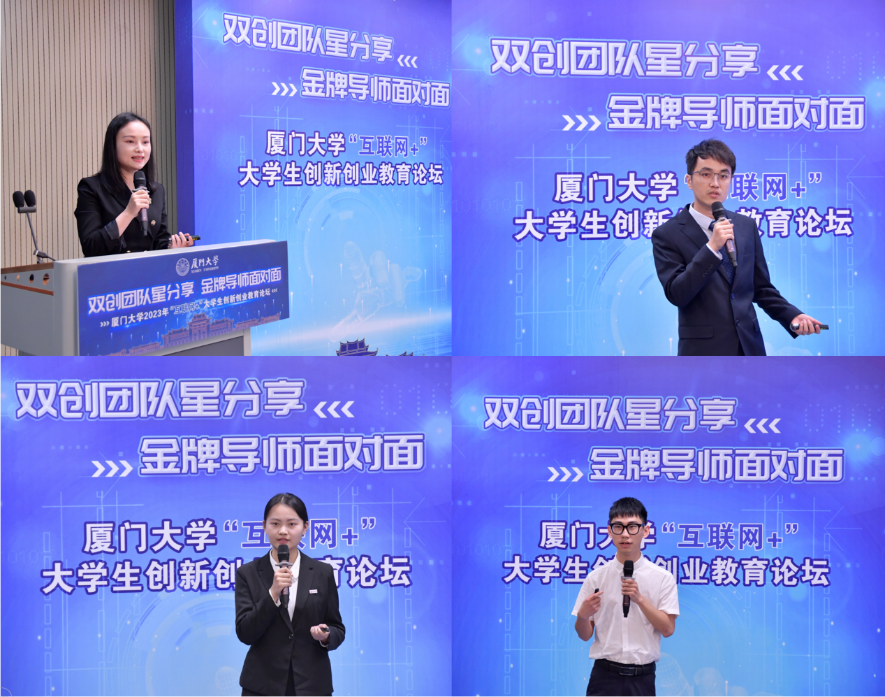 第五届 “互联网+”大赛金奖《尾矿寻宝:金属尾矿清洁高效整体解决方案领跑者》团队队长李文娟以《创业那些事儿》为主题,分享了自己的创业经历,鼓励大家在校期间通过创新创业大赛磨练自己、提升自己,树立创业意识,培养创新创业能力。第八届 “互联网+”大赛金奖《瞬捷科技:开拓智能制造新“视”界》团队队长郑顺杰讲述了自己的参赛经历,向大家展示了团队的参赛作品,提醒大家凝练参赛重点,把握宝贵机会,积极参加学科竞赛。《肝癌先知:肝癌早期筛查和诊断试剂盒开发》团队主要负责人赵祖一以《青年创客,智领未来》为题,分享了团队参赛的过程,详细介绍了本科生创意组的报名条件及比赛内容,强调创新创业要打破专业壁垒,集聚多元人才。《应用数字技术实现数字文创产品的展示》团队队长张锦鑫介绍了产业命题赛道的特点,就如何组建一支优秀的团队分享了自己的备赛经验,激励大家要想创、敢创、会创,展现厦大学子的青春风采。