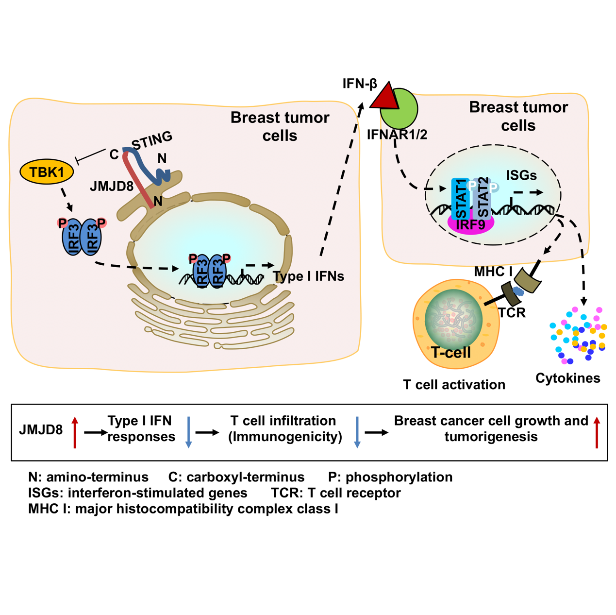 模式图:乳腺癌中高表达的JMJD8通过抑制STING-TBK1复合物从而抑制I型干扰素信号通路和抗肿瘤免疫反应,最终促进肿瘤生长。