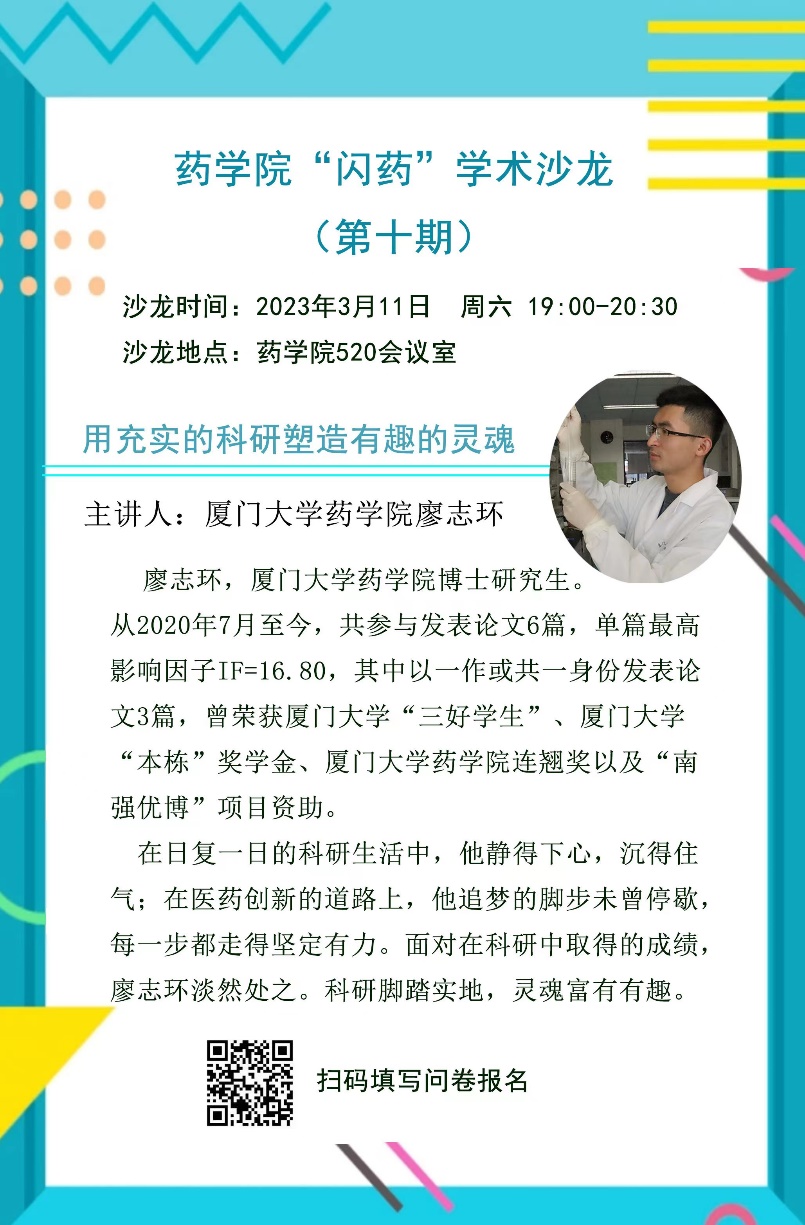 3月11日晚,药学院第十期研究生学术沙龙在庄瑾楼520会议室举行。此次活动邀请药学院2022级博士研究生廖志环担任主讲嘉宾。通过前期主动报名,共有30位同学参与其中。
