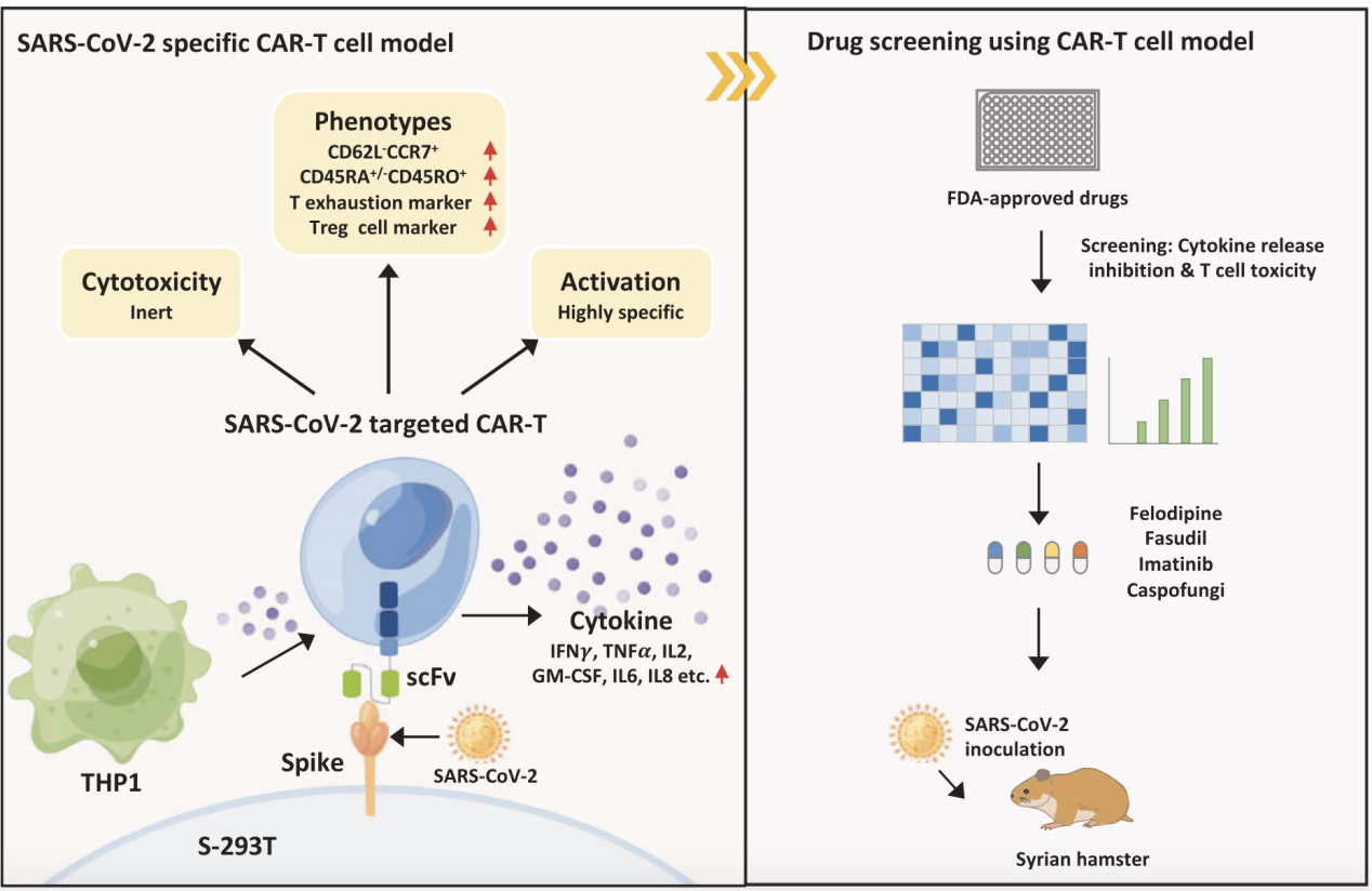 近日,细胞应激生物学国家重点实验室、福建省药物新靶点研究重点实验室、药学院刘文教授团队与国家传染病诊断试剂与疫苗工程技术研究中心、公共卫生学院夏宁邵教授团队,合作构建了一种特异性靶向SARS-CoV-2新冠病毒刺突蛋白(Spike)的嵌合抗原受体(SARS-CoV-2-S CAR),成功制备了SARS-CoV-2-S CAR感染的T细胞(SARS-CoV-2-S CAR-T),并获得了新冠特异性炎症诱导模型。基于此,研究团队对FDA已批准上市的上千种药物进行筛选,通过一系列实验确定了非洛地平、法舒地尔、伊马替尼及卡泊芬净四种药物能够有效抑制炎症因子释放,并在不同程度上缓解新冠病毒感染的地鼠模型中的致命性炎症、降低重症肺炎率及死亡率。该研究成果以题为A SARS-CoV-2-specific CAR-T-cell model identifies felodipine, fasudil, imatinib, and caspofungin as potential treatments for lethal COVID-19的研究论文在线发表在《Cellular & Molecular Immunology》。