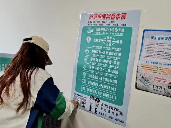 同时,学院以张贴海报、电子屏滚动播放反诈宣传标语、公众号推送、宿舍走访等多样化的宣传手段,构筑立体化安全防线,让反诈防诈深入人心。
