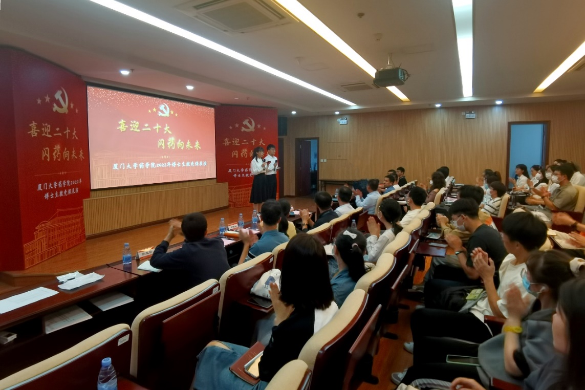金秋十月,丹桂飘香。为迎接党的二十大胜利召开,10月13日下午,药学院博士生第一党支部、第二党支部在庄瑾楼426报告厅举办“喜迎二十大,闪药向未来”药学院博士生微党课展演活动。翔安校区管委会副主任马龙,学生工作处副处长高斌,药学院党委书记宋友良,药学院副院长(主持工作)、博士生导师刘文教授,党委副书记杜超、黄旻敏,药学院副院长、博士生导师陈海峰教授、吴云龙教授,博士生导师代表吴彩胜副教授、陈思明副教授,微党课指导老师,各学生党支部委员,药学先锋班全体成员以及全体博士生参加活动。展演由2019级博士生高硕、2020级博士生许倩楠主持。