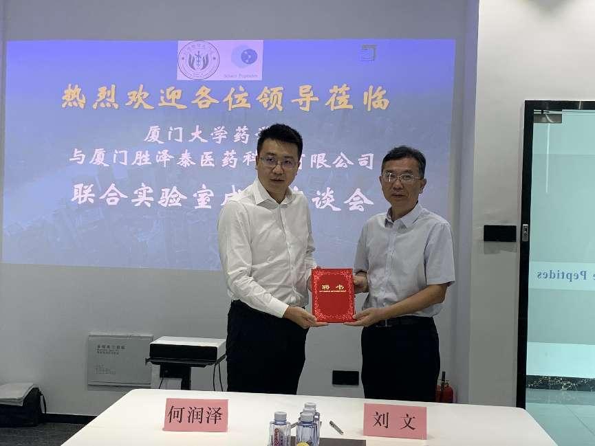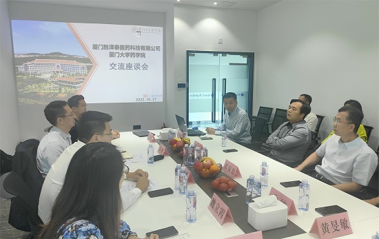 10月27日上午,药学院党委书记宋友良,副院长(主持工作)刘文带队走访厦门胜泽泰医药科技有限公司,学院党政领导、相关秘书参加活动,胜泽泰医药科技董事长何润泽、常务副总郭建、副总经理魏立霄、实验室经理林惠湦、新药项目经理朱晨、财务经理廖文婷等一同座谈交流。