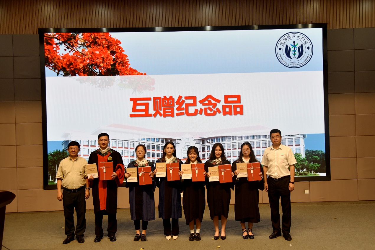 在互赠毕业纪念品环节,院党委书记陈怀锋、院长张晓坤代表学院向毕业生赠送纪念品和书籍《看万山红遍——中国共产党人的精神谱系》,希望同学们赓续红色血脉,弘扬党的优良传统。毕业生代表向学院赠送了16幅《中医药名家与经典著作》挂画,希望学院各项事业蒸蒸日上、蓬勃发展。
