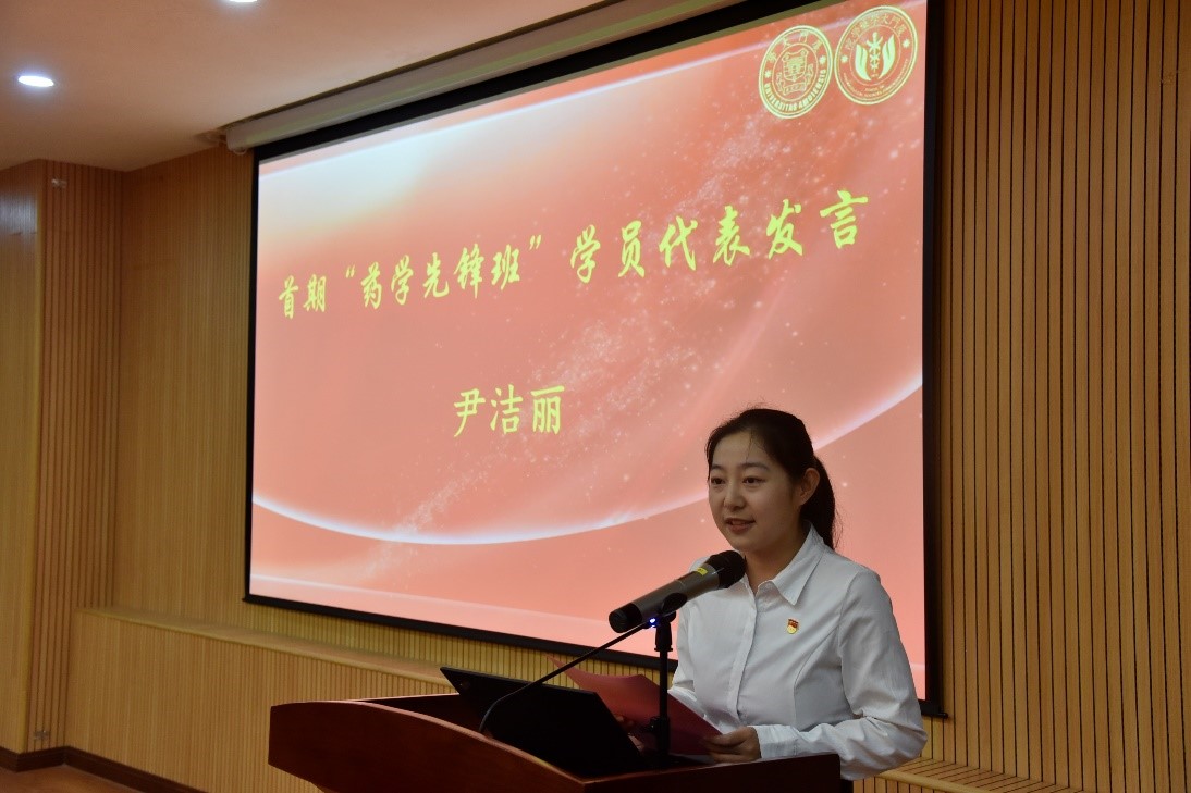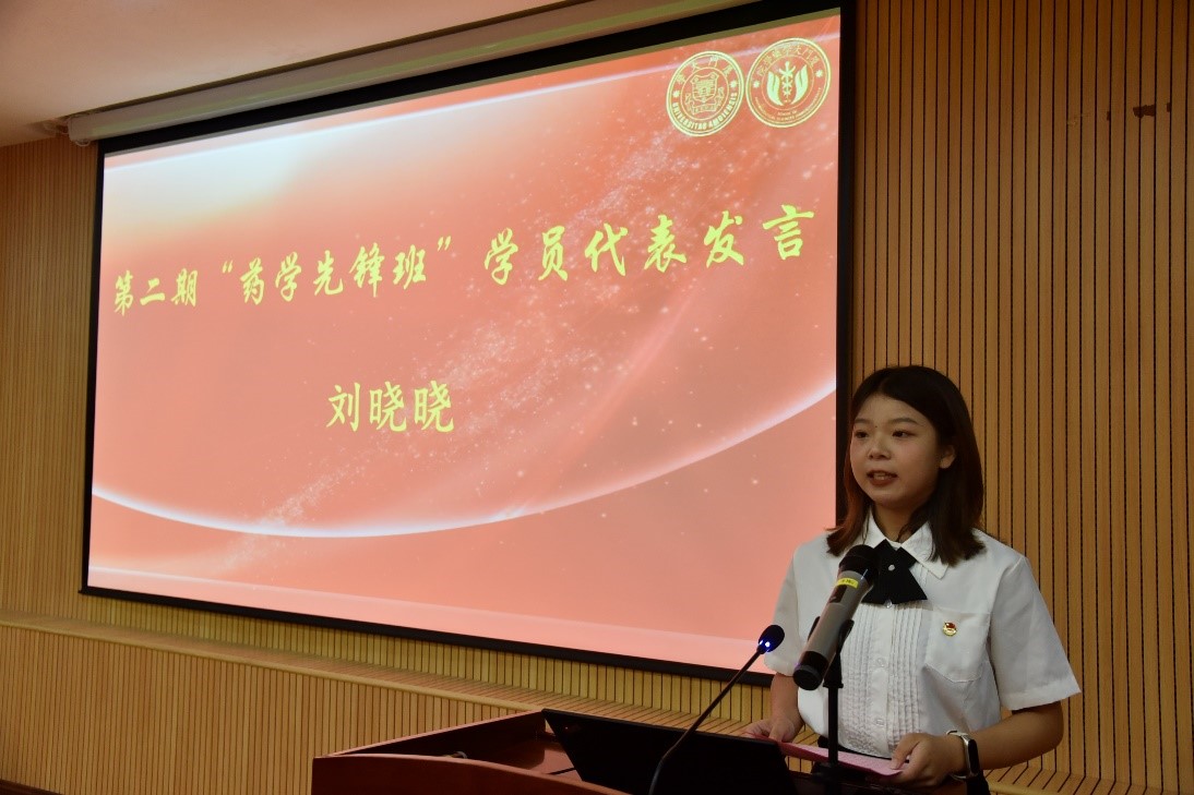 首期先锋班学员代表、2020级硕士研究生尹洁丽在发言中表示,在先锋班的一年,是硕果累累、满载收获的一年。未来会继续将学习视为成长之基,将实践作为成长之需,发挥党团骨干的先锋作用。2020级本科生刘晓晓作为第二期先锋班学员代表发言。她表示,将在未来一年的学习中以理想坚定初心、以行动践行使命,展现青春风采,不负学院期望,努力成长为药学先锋力量。