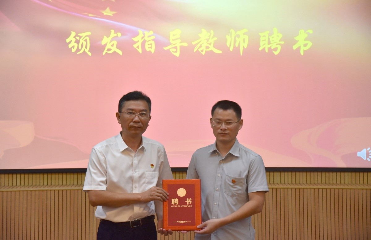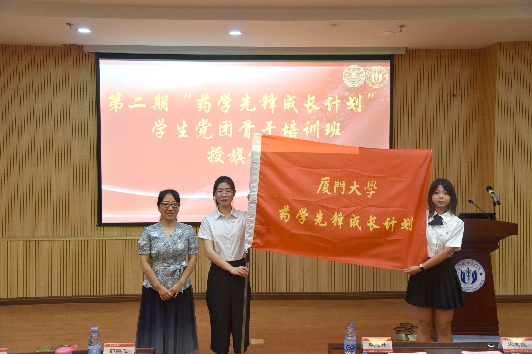 邵鹏飞为首期药学先锋班学员代表颁发结业证书。宋友良为第二期药学先锋班指导教师严小胜颁发指导教师聘书。廖志丹为第二期“药学先锋成长计划”学生党团骨干培训班授旗。