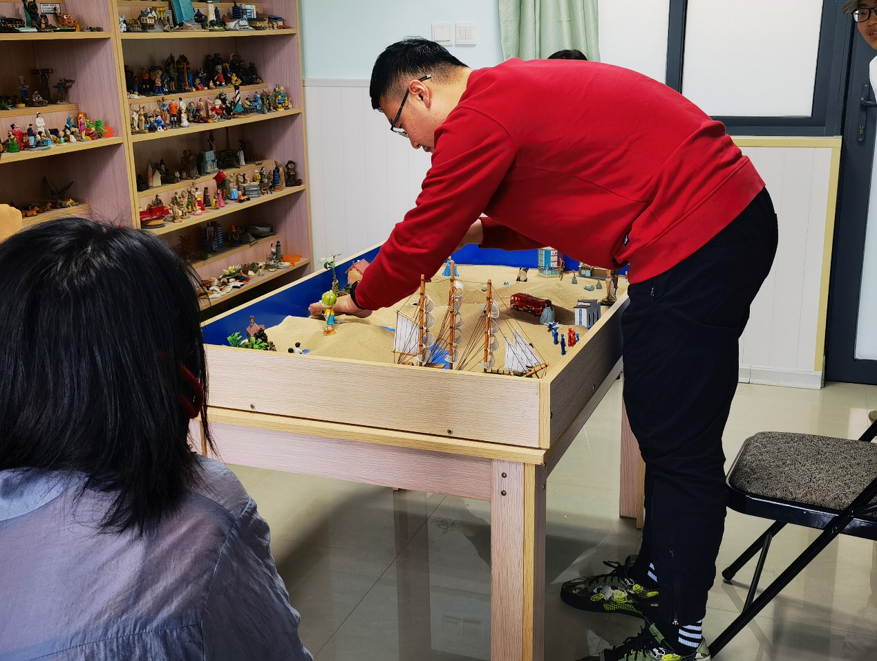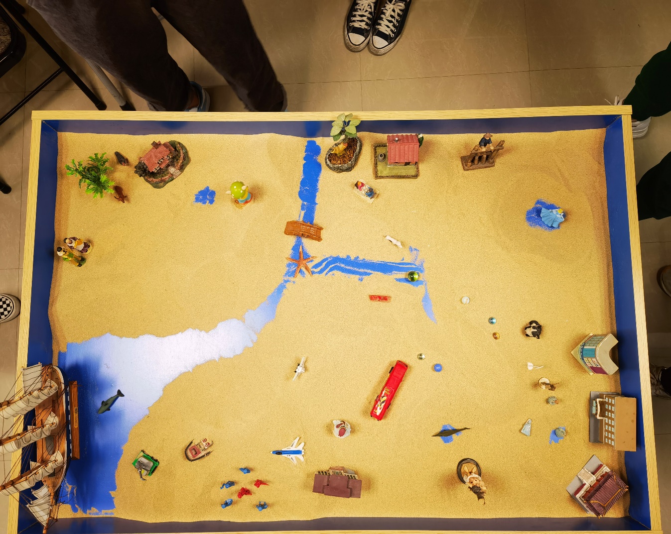 活动开始,同学们保持安静、围成一圈,依次将挑选出的沙具放置在沙盘上,通过摆放沙具、调整沙子形状、移动沙具位置等,创造出自己想象中的画面。期间,徐爽全程观察并记录同学们的行为。几轮摆放后,小小的沙盘已经形成一个缤纷多彩的“沙世界”。