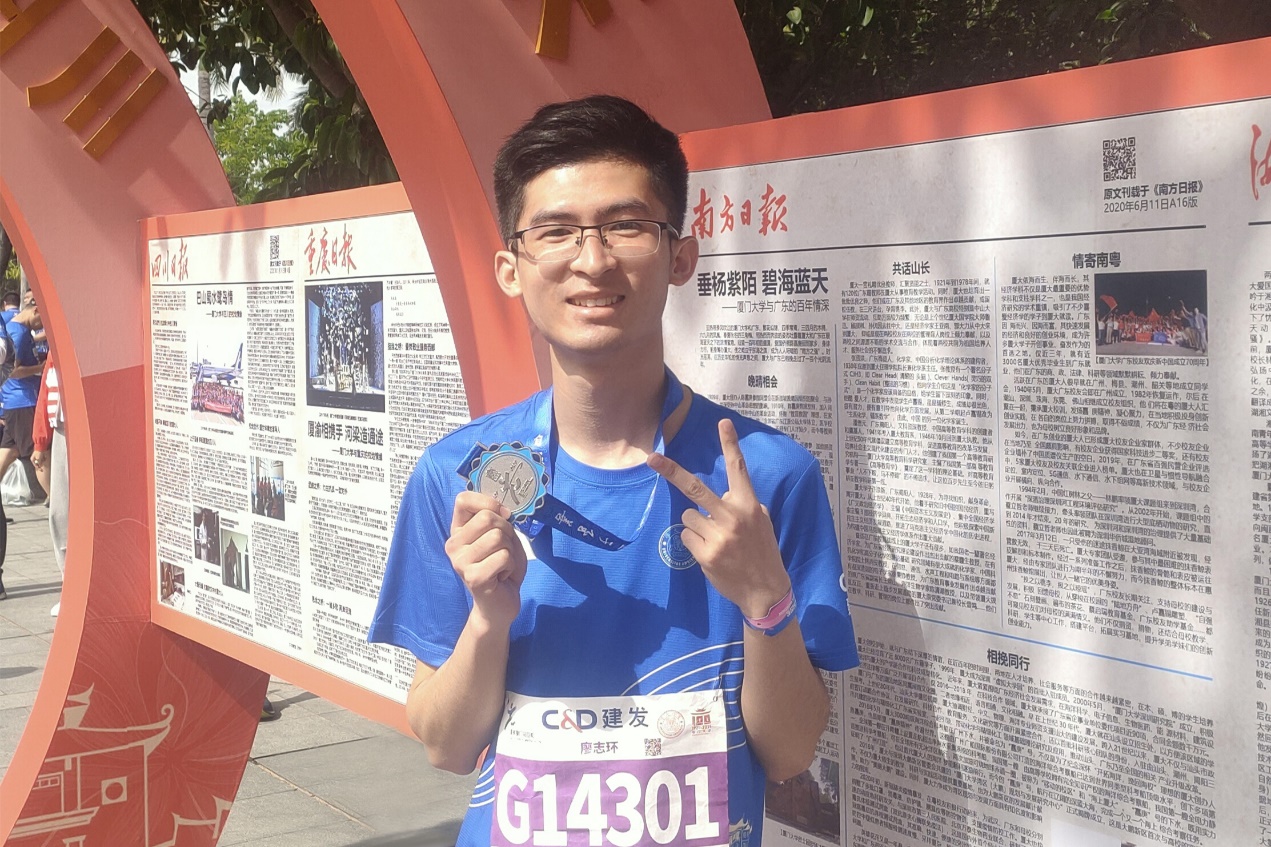 纳米药物常常通过缓释来实现持久的药效和更佳的治疗效果,科研也是一场需要耐力的长跑。学会劳逸结合、张弛有度,才能保持长久的热情。在科研之余,廖志环积极投入到志愿服务中,如八闽园·药园建设、迎新活动等,在志愿服务中体验奉献的快乐。他也热爱运动,喜欢慢跑、羽毛球等项目,踊跃报名参加2021建发厦门马拉松赛厦门大学100周年校庆专项赛和厦门大学学生田径运动会,肆意挥洒的汗水给他的生活增添了不少色彩。