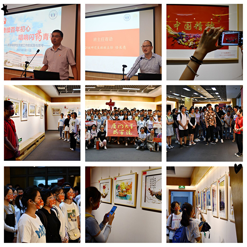 这堂别开生面的党史教育课受到新生们的热烈好评。伴随着学生讲解员动情的讲解,墙上两幅熠熠生辉的作品吸引了大家的注意:由党徽、数字“100”“1921”“2021”和光芒线组成的《金色百年》祝福伟大祖国繁荣昌盛、永葆辉煌;标本画《中国精神》则体现了厦大学子担民族大任、承中国精神的坚定决心。2021级本科生张宇涵观看展览后说道:“学长学姐们以药用植物为元素,将药物特性融进党的一段段光辉历史中,建党建校百年的丝缕金线,古田会议永放光芒的车前药子,长征征途胜利的凤凰花开,都令我印象深刻。”