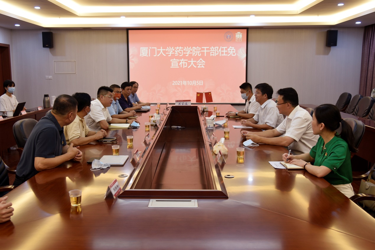 10月5日下午,药学院干部任命宣布大会在庄瑾楼520会议室召开,校党委副书记徐进功,校党委常委、组织部部长、统战部部长孙理,翔安校区办公室主任薛志平,药学院党委书记陈怀锋,院长张晓坤,党政领导班子成员、党委委员,科级以上干部、辅导员参加会议。会议由孙理主持。