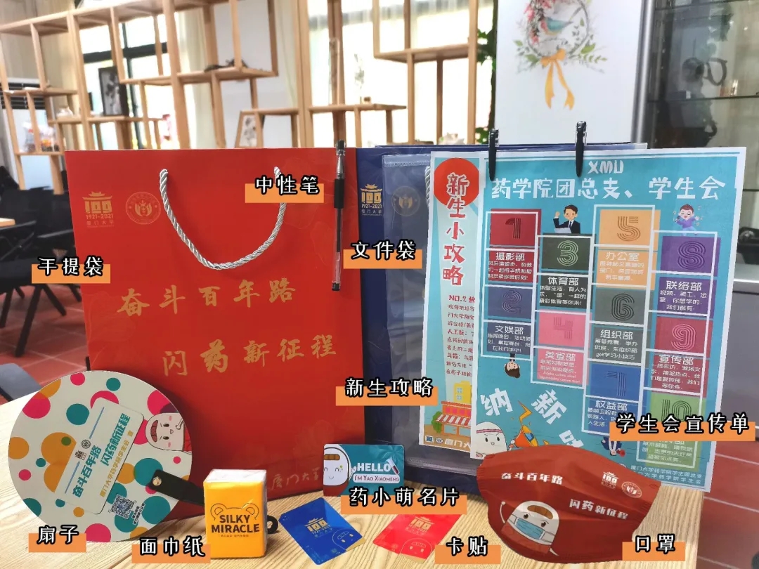 一个贴心礼包:新生报到注册后,就能领到学院准备的“药小萌”大礼包:文件袋、纸袋、卡贴、湿巾、口罩、扇子等,这些特别定制的文创产品不仅实用性强,还融合了药学院拟人卡通“药小萌”的形象,可爱大方,加强了新生对学院文化的认同感和归属感。