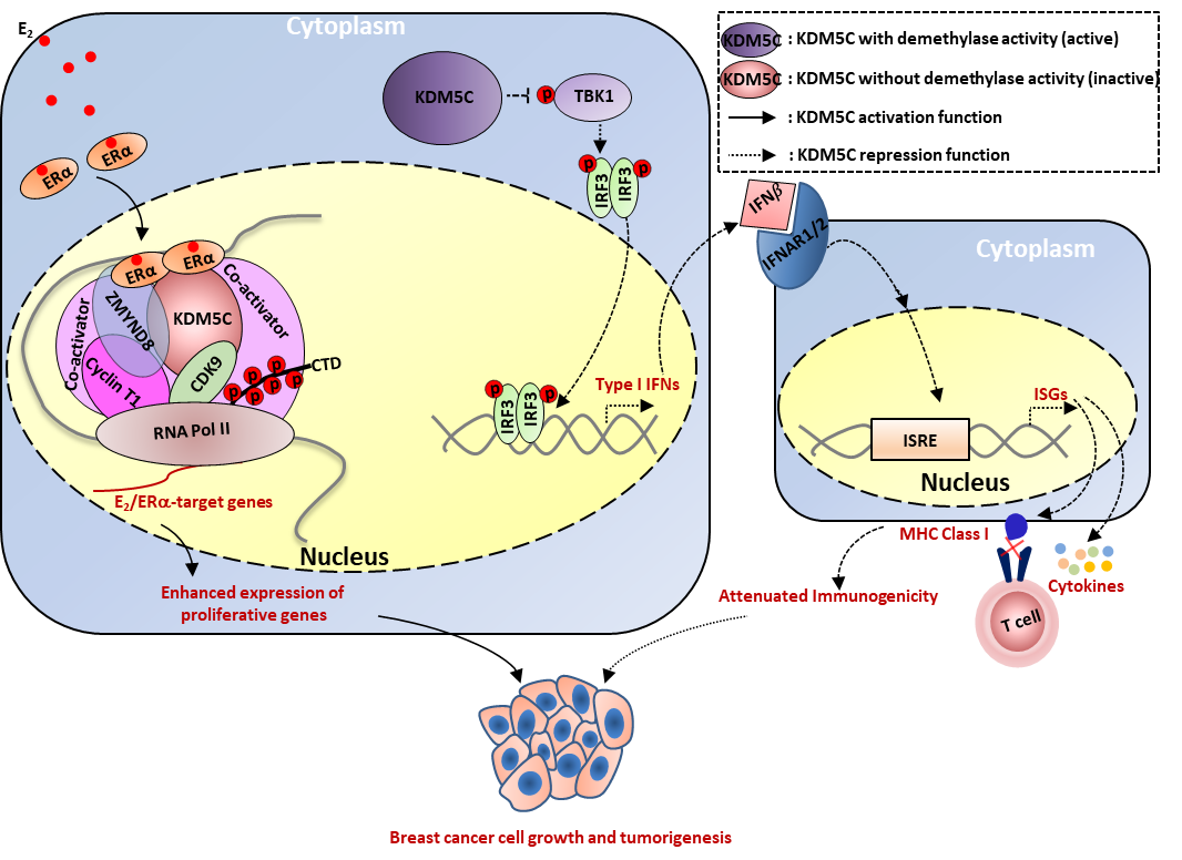 在该研究中,研究团队首先通过对组蛋白去甲基酶家族的系统筛选,并结合临床表达以及临床预后的数据,确定了KDM5C是参与雌激素/雌激素受体介导的靶基因转录激活和乳腺癌细胞生长的候选基因之一。KDM5C被发现分布在细胞核和细胞质内。核内的KDM5C能去甲基化组蛋白H3K4me2/3修饰,一直认为是一个转录共抑制因子,所以探究其如何参与基因转录激活成为一个重要的科学问题。团队利用RNA-seq和ChIP-seq等高通量测序技术并结合生物信息学分析发现在雌激素的刺激下,细胞核内KDM5C被招募到染色质上雌激素受体结合的活性增强子处。在这些增强子处,KDM5C由于其通过酶活性区域与雌激素受体相互作用,其去甲基化酶活性被雌激素受体掩盖。进一步研究发现KDM5C通过招募P-TEFb复合物激活雌激素靶基因,变成一个转录共激活因子。同时,细胞质内的KDM5C被发现通过直接和TBK1相互作用并抑制TBK1磷酸化来抑制I型干扰素和干扰素靶基因,保护细胞免受免疫监视,并且这种功能是依赖于其酶活性的。由此,KDM5C能够通过激活和生长等密切相关的雌激素受体(ERα)靶基因来促进细胞生长,并抑制I型干扰素(IFNs)和干扰素靶基因(ISGs)来逃避免疫监视,从而协同促进雌激素受体阳性乳腺癌发生发展的研究成果。值得一提的是,KDM5C相互作用蛋白ZMYND8参与了KDM5C所调控的基因激活和抑制。最后,研究团队通过对小鼠皮下移植瘤联合使用雌激素受体抑制剂和KDM5家族的酶活性抑制剂,证明了同时抑制雌激素受体信号通路和KDM5活性能有效抑制雌激素受体阳性乳腺癌细胞生长和肿瘤发生。这项研究不仅为乳腺癌提供了一个新的药物靶点和一个潜在的治疗方案,同时也为针对KDM5家族的小分子抑制剂的筛选提供了理论基础。