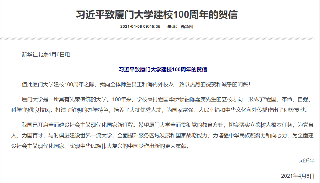 厦门大学建校100周年校庆日之际,中共中央总书记、国家主席、中央军委主席习近平4月6日致信祝贺厦门大学建校100周年,向全体师生员工和海内外校友致以热烈的祝贺和诚挚的问候。