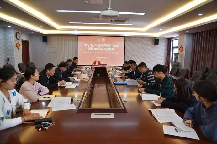 会上,全体与会人员集体观看了厦门大学建校100周年大会上教育部党组书记、部长陈宝生宣读习近平总书记贺信的片段以及4月6日《新闻联播》关于习近平总书记致信祝贺厦门大学建校100周年相关报道,并展开热烈交流和讨论。