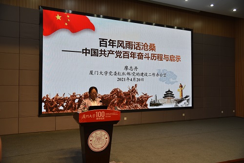 为进一步扎实开展党史学习教育,4月20日中午,药学院、公共卫生学院在翔安校区图书馆报告厅联合举办党史学习教育专题报告会,邀请学校党建办主任兼组织部副部长、教师工作部副部长廖志丹作题为《百年风雨话沧桑——中国共产党的百年奋斗历程与启示》专题报告。报告会由公共卫生学院党委副书记杨机像主持。两学院党政领导、师生约300人参加。