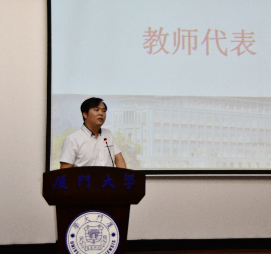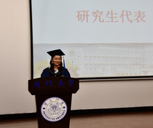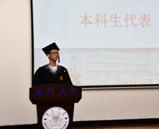 2016级本科生陈凯峰和2017级硕士生吴妍蒙作为毕业生代表先后发言。两位同学回顾了自己在厦大度过的充实、美好的求学时光,表达了对学校、学院、老师、同学们的感恩之情,与对未来的憧憬和向往。他们表示,自己会肩负“厦大人”的身份,在未来的人生旅程上迎着风雨砥砺前行,不负学校和学院对自己的期待,为母校争光,为药学院争光。