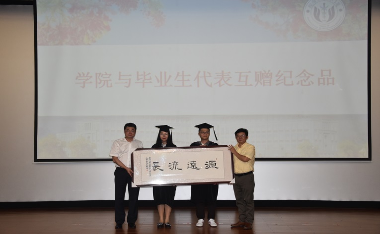 在毕业生们踏上新的旅程之际,学院为每位毕业生准备了一份纪念品,毕业生们也自发为学院回赠了礼物。学院领导和毕业生代表互赠纪念品。