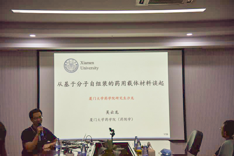 7月10日晚七点,药学院研究生学术沙龙第一期活动在药学院520会议室举行。药学院吴云龙教授受邀担任本期主讲嘉宾,带来“从基于分子自组装的药用载体材料谈起”的主题分享报告。学院党委副书记杜超,霍帅东教授,田文静助理教授,团委副书记范荣和前期线上报名的30位研究生一起参加了沙龙,沙龙由2018级硕士研究生朱星燊主持。