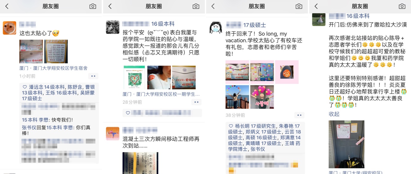 “返校后的心情和感受如何?”对这个问题,来自湖北的2017级硕士生林同学说起来似乎“滔滔不绝”,她说:“刚收到返校通知的时候,又激动又忐忑,激动的是离开校园这么长时间终于能回来了,忐忑的是怕自己回校过程会困难重重。但是收到学校学工组老师的一次次电话提醒和嘘寒问暖后,忐忑的感觉完全消失了。从出厦门北站见到老师同学的那一刻起,直到走进宿舍看到学院为我们精挑细选的各类生活物资,自己始终沉浸在幸福的感觉中,真是太贴心、太暖心了,毕业前这样的记忆,必将一生难忘!”